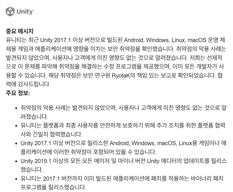 - iOS 플랫폼에서는 취약점이 악용될 가능성이 발견되지 않았습니다. 다만 최고 수준의 보안을 위해, 유니티에서는 최신 패치가 적용된 Unity 에디터로 앱을 다시 빌드할 것을 권장합니다.