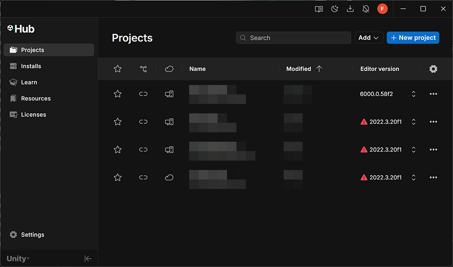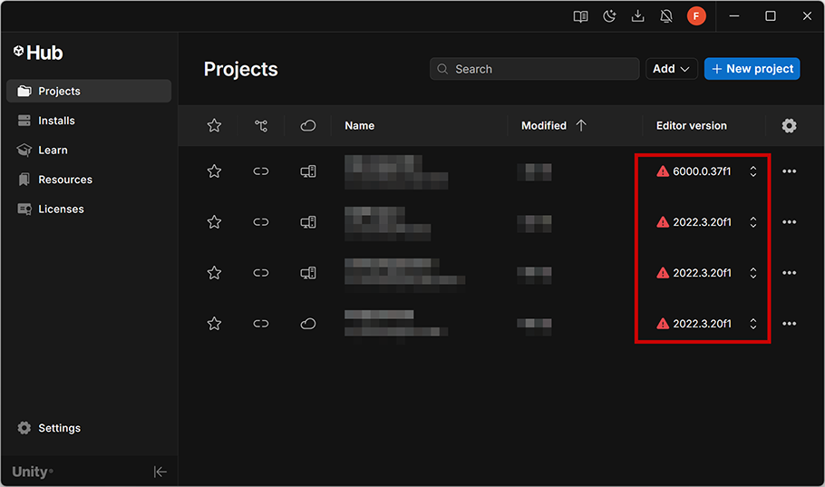 일단 Unity Hub를 켜보면, 다음과 같이 기분 나쁜 빨간 느낌표를 마주할 수 있다. ( 만약 뜨지 않는다면 Unity Hub를 최신 버전으로 업데이트 하라! )