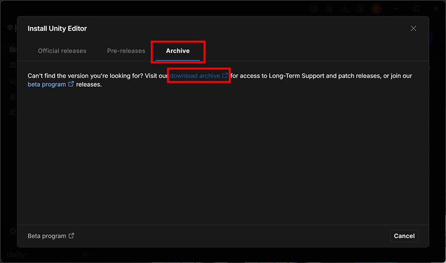 Archive 탭을 누르고, download archive 라는 링크를 눌러 Unity 다운로드 웹 아카이브 페이지로 이동한다.